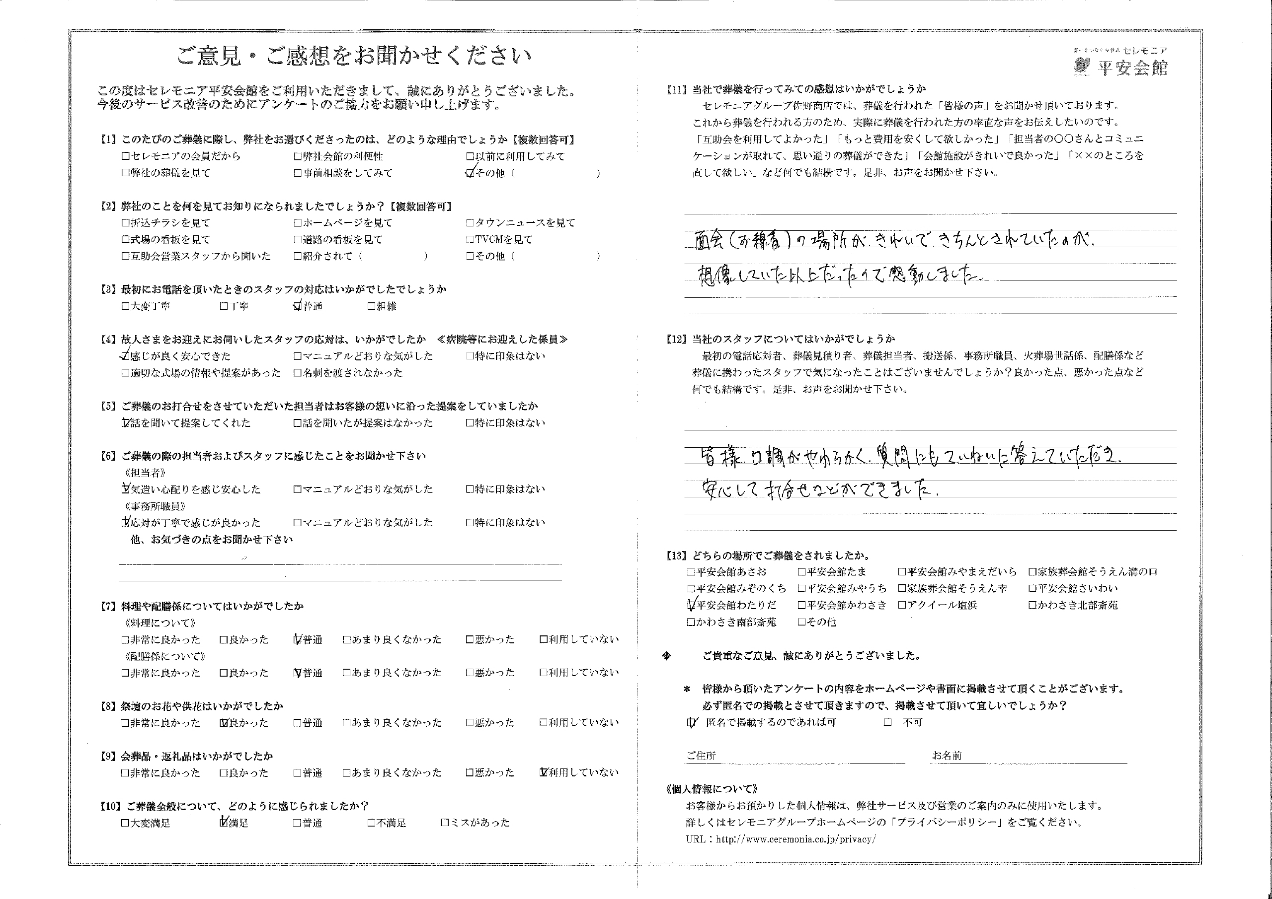 平安会館わたりだを利用されたお客様の声